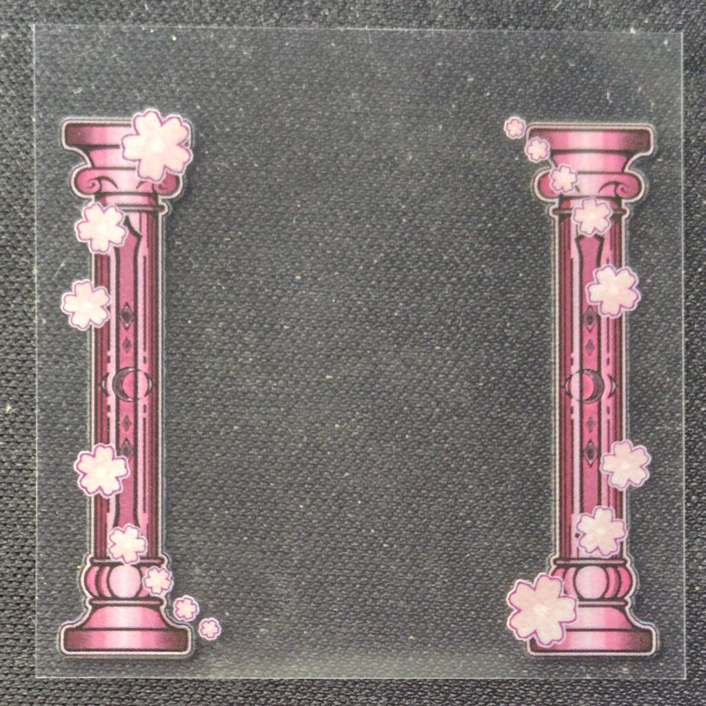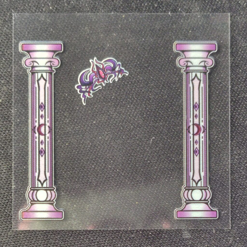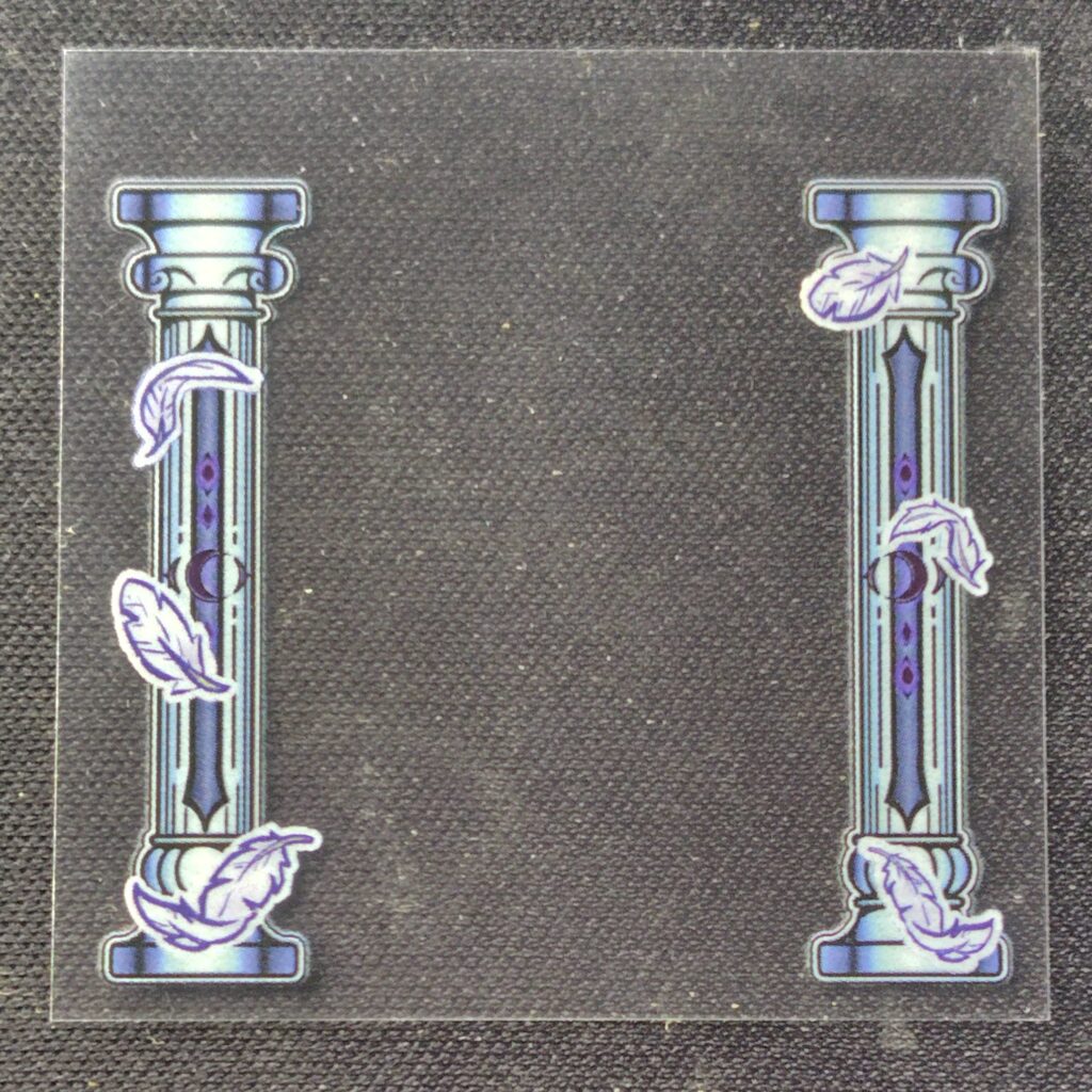 最初はステンドグラス風のシールをと思いあれこれ描いてみたのですがどれもしっくりこず、最終的にタロットカード風+柱というデザインになりました。