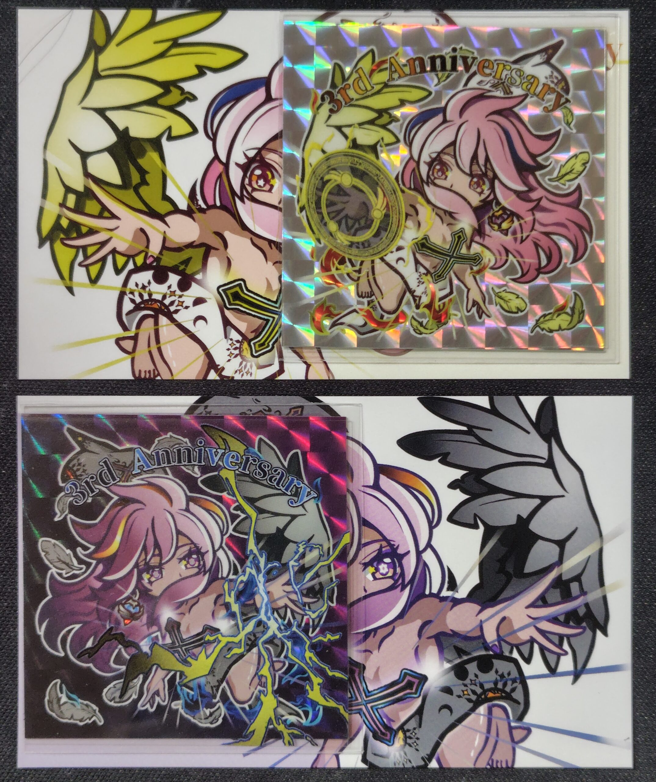 それぞれプリズムシールの上に透明シールを重ねた画像がこちらです。だいたいこんな感じになるかと思います。